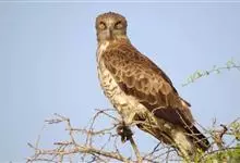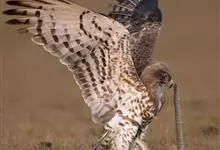 短趾雕:体长62-70厘米,体重1.2-2.3千克。它们的颔、颈和胸部上方呈浅棕色。头部浑圆像猫头鹰般,眼睛呈鲜黄色。身体沉重,上体灰褐,下体白而具深色纵纹,喉及胸单一褐色,腹部具不明显的横斑,…全部>>
