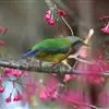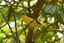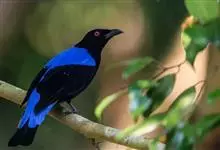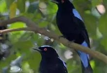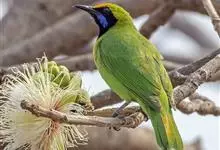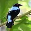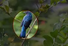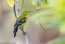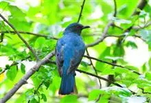 蓝翅叶鹎:小型鸟类,体长15-18厘米。雄鸟通体草绿色,尾蓝绿色,肩和翅亮蓝 色,胸缀有黄色,颏、喉黑色。雌鸟颏,喉蓝绿色。栖息在海拔1500米以下的常绿阔叶林、次生林和林缘疏林灌丛中。…全部>>