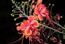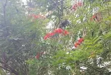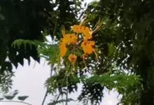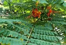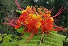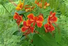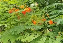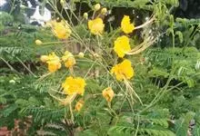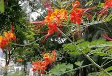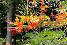 洋金凤 Sw.),豆科小凤花属灌木状或小乔木植物,枝无毛,绿或粉绿色;二回羽状复叶;总状花序伞房状,萼片无毛,花瓣橙红或黄色,圆形,花丝红色,子房无毛,花柱橙黄色;荚果窄而薄,…全部>>