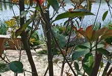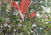 石楠 Kalkman),是蔷薇科石楠属的常绿乔木,高5~12米,株型紧凑,树冠圆球形。树枝为褐灰色;鳞片为褐色,没有毛;叶片革质,长椭圆至侧卵状椭圆形,有锯齿,新叶红色光亮。复伞房花序,白色小花,…全部>>