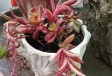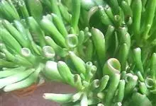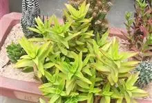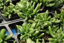 筒叶花月,是景天科青锁龙属的多年生草本植物。植株多分株,灌木状,茎较粗壮,圆柱形,表皮灰褐色;叶片肉质,互生,呈圆筒状,簇生于茎或分枝顶端,叶端呈斜截形,截面为椭圆形;花呈星状,淡白色;花期秋季。…全部>>