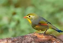 银耳相思鸟小型鸟类,体长14~18厘米。头顶黑色,耳羽银灰色,前额橙黄色;外侧飞羽橙黄色,基部朱红色,极为鲜艳、醒目。尾圆形,尾上、尾下覆羽朱红色,尾暗灰褐色,外侧尾羽橙黄色,其余上体橄榄绿或橄榄黄色。…全部>>