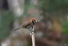 点胸鸦雀是莺科、鸦雀属小型鸟类,体长18-21厘米。头顶至枕橙棕色,嘴橙黄色、短而粗厚,脸皮黄色,耳覆羽和颊后部黑色,眼圈白色。上体棕褐色。颏黑色,其余下体淡皮黄白色,喉和上胸具黑色矢状斑。…全部>>
