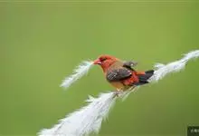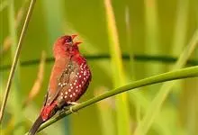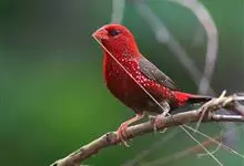红梅花雀小型鸟类,体长9-10厘米。雄鸟通体朱红色,背、肩、胸等满布白色小斑点,两翅和尾黑褐色均具白色端斑,嘴红色,脚蜡黄色。雌鸟上体淡褐色或赭褐色,翅上中覆羽、大覆羽和内侧飞羽末端具白色斑点,…全部>>