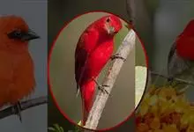 藏朱雀:全长约17-18厘米。雄鸟头部深红色具光辉,喉部暗红色具白色点斑;背部灰白色,各羽具玫瑰红色羽端,形成许多斑纹;腰部淡玫瑰红色;翅暗褐色,沾灰白,羽端沾玫瑰红或灰白色;尾暗棕色,端缘玫瑰红色…全部>>