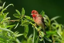 普通朱雀是雀形目雀科朱雀属鸟类,又名红朱雀、马料、青麻料。雄鸟上体红色,下体淡红色;头部、喉部、胸部及腰部亮红色;背部褐色染红色;两翼及尾黑褐色,羽缘染红色。雌鸟上体橄榄褐色,下体近白色,…全部>>