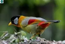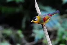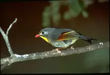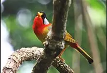 银耳相思鸟小型鸟类,体长14~18厘米。头顶黑色,耳羽银灰色,前额橙黄色;外侧飞羽橙黄色,基部朱红色,极为鲜艳、醒目。尾圆形,尾上、尾下覆羽朱红色,尾暗灰褐色,外侧尾羽橙黄色,其余上体橄榄绿或橄榄黄色。…全部>>