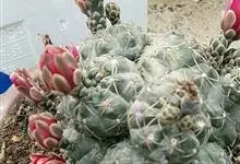 绯花玉 Speg.)是仙人掌科、裸萼球属多肉植物,植株呈扁球形,表皮墨绿色,刺针状,每个刺座有5枚灰色周刺,花生于球体顶端,夏季开花,花色有白、粉红、深红等。果实纺锤形,深灰绿色,种子黑色。…全部>>