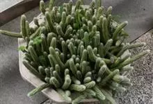 筒叶花月,是景天科青锁龙属的多年生草本植物。植株多分株,灌木状,茎较粗壮,圆柱形,表皮灰褐色;叶片肉质,互生,呈圆筒状,簇生于茎或分枝顶端,叶端呈斜截形,截面为椭圆形;花呈星状,淡白色;花期秋季。…全部>>