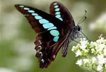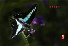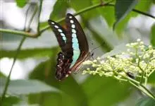 青带凤蝶Graphium sarpedon ,又名青凤蝶,是最普遍的中型凤蝶,飞行速度很快。青带凤蝶的翅膀中央有许多浅蓝色的斑点,很整齐地排列成一条直线。这些斑点由上而下逐渐变大,就像一条青色的带子。全部>>