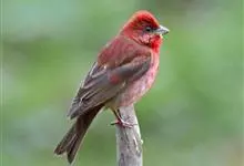 酒红朱雀小型鸟类,体长13~15厘米。雄鸟通体深红色,头部深朱红或棕红色,下背和腰玫瑰红色,眉纹粉红色而具丝绢光泽。两翅和尾黑褐或灰褐色、具暗红色狭缘,内侧两枚三级飞羽具淡粉红色先端。…全部>>