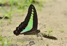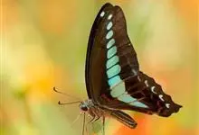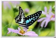 青带凤蝶Graphium sarpedon ,又名青凤蝶,是最普遍的中型凤蝶,飞行速度很快。青带凤蝶的翅膀中央有许多浅蓝色的斑点,很整齐地排列成一条直线。这些斑点由上而下逐渐变大,就像一条青色的带子。全部>>