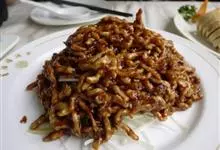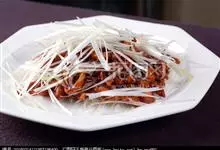 京酱肉丝,是一道知名度很高的菜肴,它是北京菜中的经典代表菜之一。制作时选用猪瘦肉为主料,辅以甜面酱、葱、姜及其它调料,用北方特有烹调技法“六爆”之一的“酱爆”烹制而成。 成菜后,咸甜适中,酱香浓郁…全部>>