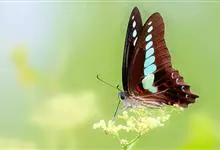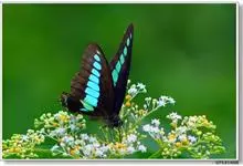 青带凤蝶Graphium sarpedon ,又名青凤蝶,是最普遍的中型凤蝶,飞行速度很快。青带凤蝶的翅膀中央有许多浅蓝色的斑点,很整齐地排列成一条直线。这些斑点由上而下逐渐变大,就像一条青色的带子。全部>>
