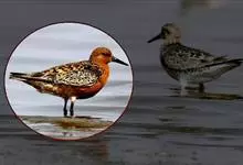 红腹滨鹬,是鹬科、滨鹬属的小型涉禽,体长23-25厘米,嘴较短而直、黑色,脚亦甚短、绿色。体较粗胖。夏季上体灰褐色具黑色中央纹,背具棕栗色和白色斑纹和羽缘,头侧和整个下体栗红色。冬季棕红色消失,…全部>>