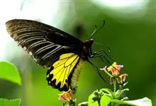 金裳凤蝶是凤蝶科、裳凤蝶属的动物。金裳凤蝶身体呈黑色,头、颈和胸侧有红毛,腹部有黑黄两色相间条纹,雄蝶前翅黑色,具黑天鹅绒光泽,各脉两侧灰白色,后翅金黄色,各室外缘有等腰三角形黑斑1枚,斑内侧有晕,…全部>>