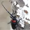 桃红颈天牛是天牛科、颈天牛属昆虫。体黑色发亮,前胸背面大部分为光亮的棕红色或完全黑色。头黑色,腹面有许多横皱,头顶部两眼间有深凹。触角蓝紫色,前胸背面前后缘呈黑色并收缩下陷密布横皱。鞘翅表面光滑。…全部>>
