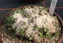 惠比须笑是夹竹桃科棒捶树属多年生肉质植物。根茎不规则膨大,肉质,内含大量水分,外皮褐色至灰色,具不规则突起和皮刺。叶长椭圆形,长3cm— 5cm,宽约1cm。深绿色,叶柄直接着生于根茎突起部位。…全部>>