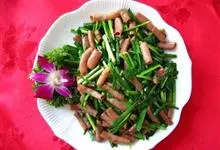 韭菜拌海肠是中国菜系鲁菜菜系中很有特色的菜式之一,韭菜拌海肠以韭菜为主要材料,烹饪以拌菜为主。特色:海肠清脆鲜红,韭菜脆嫩鲜绿,红绿相间,顺色顺味。全部>>