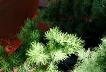 蓬莱松是天门冬科、天门冬属多年生丛生草本植物。宿存,圆柱形肉质根,纵截面为绿色和表面灰色。植株高可达3米。茎呈圆柱形或近四边形,底部木质化,具有灰色或灰褐色。幼嫩的茎在每个节上都被紫绿色鳞片包,…全部>>