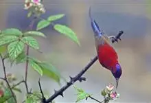 藏朱雀:全长约17-18厘米。雄鸟头部深红色具光辉,喉部暗红色具白色点斑;背部灰白色,各羽具玫瑰红色羽端,形成许多斑纹;腰部淡玫瑰红色;翅暗褐色,沾灰白,羽端沾玫瑰红或灰白色;尾暗棕色,端缘玫瑰红色…全部>>