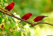血雀雀科朱雀属鸟类,体重36-49克;体长155-182毫米。雄鸟除眼先、翼与尾为黑色外,通体为鲜红色;嘴鲜黄;雌鸟暗橄榄绿色,羽端较淡或带黄色;腰鲜黄;嘴较暗。虹膜褐色;嘴黄色;腿和脚褐色。…全部>>