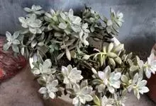 胧月 E.Walther)是景天科,风车草属多肉植物,常绿蔓生亚灌木,叶肥厚无柄,灰蓝色,阳光充足时呈粉红色,叶片枝顶簇生成莲座状,乳白色,花冠5裂,上有紫红色斑点,雄蕊两轮排列,花药鲜红色,…全部>>