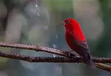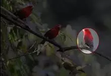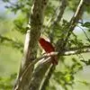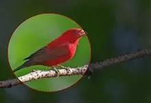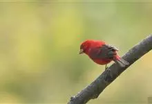 血雀雀科朱雀属鸟类,体重36-49克;体长155-182毫米。雄鸟除眼先、翼与尾为黑色外,通体为鲜红色;嘴鲜黄;雌鸟暗橄榄绿色,羽端较淡或带黄色;腰鲜黄;嘴较暗。虹膜褐色;嘴黄色;腿和脚褐色。…全部>>