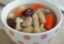 鸡爪8个,香菇10克,冬笋15克,火腿15克,熟鸡油10克,精盐2克,味精1克,绍酒10克,葱姜汁5克,鸡汤1000克。 全部>>