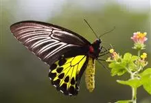 金裳凤蝶是凤蝶科、裳凤蝶属的动物。金裳凤蝶身体呈黑色,头、颈和胸侧有红毛,腹部有黑黄两色相间条纹,雄蝶前翅黑色,具黑天鹅绒光泽,各脉两侧灰白色,后翅金黄色,各室外缘有等腰三角形黑斑1枚,斑内侧有晕,…全部>>