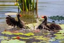 黑水鸡:是鹤形目、秧鸡科的鸟类,共有12个亚种。中型涉禽,体长24-35厘米。嘴长度适中,鼻孔狭长;头具额甲,后缘圆钝;嘴和额甲色彩鲜艳。翅圆形,第2枚初级飞羽最长,或第2枚和第3枚初级飞羽等长,…全部>>