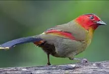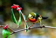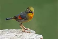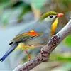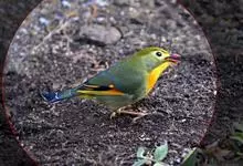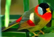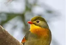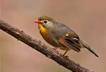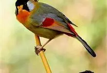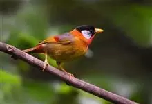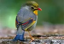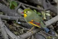 银耳相思鸟小型鸟类,体长14~18厘米。头顶黑色,耳羽银灰色,前额橙黄色;外侧飞羽橙黄色,基部朱红色,极为鲜艳、醒目。尾圆形,尾上、尾下覆羽朱红色,尾暗灰褐色,外侧尾羽橙黄色,其余上体橄榄绿或橄榄黄色。…全部>>