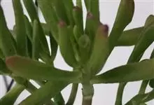 筒叶花月,是景天科青锁龙属的多年生草本植物。植株多分株,灌木状,茎较粗壮,圆柱形,表皮灰褐色;叶片肉质,互生,呈圆筒状,簇生于茎或分枝顶端,叶端呈斜截形,截面为椭圆形;花呈星状,淡白色;花期秋季。…全部>>