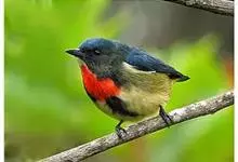红胸啄花鸟:体重5-10克,体长60-92毫米。体形纤小。雄鸟上体呈辉亮的金属绿色;下体棕黄,胸部具一朱红色块斑,极易与其他啄花鸟区别。雌鸟上体呈橄榄绿,下体棕黄色。虹膜褐色,嘴褐黑色或角灰色,…全部>>