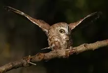 小雕鸮是脊索动物门鸟纲今颚总目、鸮形目雕鸮属动物。面盘显著,为淡棕黄色,杂以褐色的细斑。眼先密被白色的刚毛状羽,各羽均具黑色端斑。眼的上方有一个大形黑斑。皱领为黑褐色。头顶为黑褐色,羽缘为棕白色,…全部>>