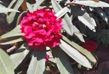 问客杜鹃:灌木,高1-3米。幼枝细长,密被腺体状鳞片。叶革质,椭圆形,卵状披针形或长圆形,上面被鳞片,幼叶中脉被毛或无毛,下面灰绿色。花序顶生,3-4花,伞形着生或短总状;花萼长环状或波状浅裂;花冠…全部>>