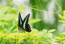 青带凤蝶Graphium sarpedon ,又名青凤蝶,是最普遍的中型凤蝶,飞行速度很快。青带凤蝶的翅膀中央有许多浅蓝色的斑点,很整齐地排列成一条直线。这些斑点由上而下逐渐变大,就像一条青色的带子。全部>>