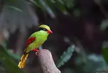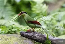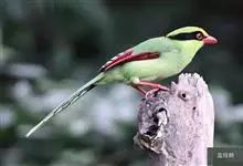 蓝绿鹊:中型鸟类,共有5个亚种。体长36-38厘米。尾长,嘴、脚红色。通体羽色主要为草绿色,宽阔的黑色贯眼纹向后延伸到后颈,在绿色的头侧极为醒目。两翅栗红色,内侧飞羽具黑色次端斑和白色尖端。尾绿色,…全部>>