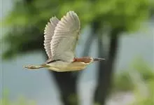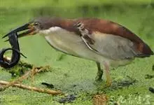 紫背苇鳽是鹭科、苇鳽属动物,为涉禽,体长约33厘米。头顶黑色,后头至尾上覆羽暗栗褐色;翅上覆羽橄榄黄色;下体浅棕黄色。多生活于水库和山脚边的稻田、芦苇丛、滩涂及沼泽草地,在西藏见于海拔2300米的农田,…全部>>