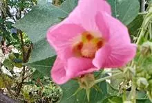木芙蓉,锦葵科木槿属落叶灌木或小乔木。小枝上有细绒毛;叶片为卵状心形,托叶为披针形,常早落;花单生,花萼为钟形,花冠初为白色或淡红色,后逐渐变为深红色;果实为扁球形,有淡黄色的毛附着。花期8到10月。…全部>>