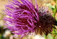 魁蓟菊科蓟属植物,多年生草本,高达1米,茎枝被长毛,基部和下部茎生叶长椭圆形或倒披针状长椭圆形,羽状深裂,侧裂片8-12对,头状花序排成伞房花序;总苞钟状,径达4厘米,总苞片8层,瘦果灰黑色,…全部>>