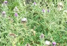 刺儿菜,别名小蓟、大刺儿菜、大蓟等,是菊科蓟属丝路蓟的一个变种,为多年生草本植物。其茎直立,全部茎叶两面同色,绿色或下面色淡,两面无毛,极少两面异色,上面绿色,无毛,下面被稀疏或稠密的绒毛而呈现灰色的,…全部>>