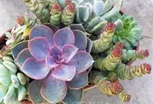 紫珍珠是景天科石莲花属的多年生肉质草本植物。植株中小型;叶片肉质,匙形,呈莲座状紧密排列;叶片粉紫色,叶缘呈粉白色,光照充足时颜色亮丽,不足时叶色会呈现深绿色或灰绿色,叶面光滑,被轻微白粉,…全部>>