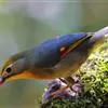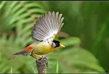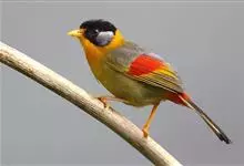 银耳相思鸟小型鸟类,体长14~18厘米。头顶黑色,耳羽银灰色,前额橙黄色;外侧飞羽橙黄色,基部朱红色,极为鲜艳、醒目。尾圆形,尾上、尾下覆羽朱红色,尾暗灰褐色,外侧尾羽橙黄色,其余上体橄榄绿或橄榄黄色。…全部>>