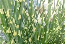 斑叶芒是禾本科、芒属多年生草本植物。丛生状,茎高可达1.7米。叶片有黄色不规则斑纹,非常亮丽下面疏生柔毛并被白粉,具黄白色环状斑。圆锥花序扇形,小穗成对着生,两性花,花黄色,花序紫红色。…全部>>