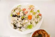 什锦炒饭是一道色香味俱全的名点,以江苏扬州的炒饭最知名。虾仁去泥肠洗净,加料酒、胡椒粉、淀粉上浆。胡萝卜洗净,切小片。蘑菇洗净、切块。将虾仁、豌豆粒、蘑菇倒入沸水锅中,焯烫至断生,捞出沥水。…全部>>