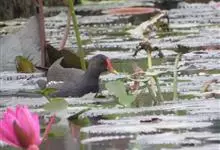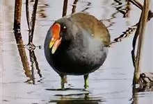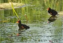 黑水鸡:是鹤形目、秧鸡科的鸟类,共有12个亚种。中型涉禽,体长24-35厘米。嘴长度适中,鼻孔狭长;头具额甲,后缘圆钝;嘴和额甲色彩鲜艳。翅圆形,第2枚初级飞羽最长,或第2枚和第3枚初级飞羽等长,…全部>>