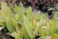 金脉美人蕉叶片淡黄色,叶脉绿化,叶缘具红边,全缘,大花美人蕉之变种全部>>