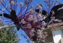 烟火树 Merr.)是唇形科、大青属常绿灌木或小乔木,株高可达4米。幼枝方形,墨绿色。叶对生,长椭圆形或披针形,先端尖,全缘或波状缘。纸质,叶背暗紫红色。聚伞状圆锥花序,顶生,小花多数,聚生成团,…全部>>