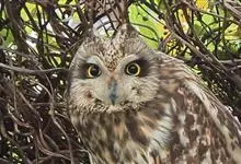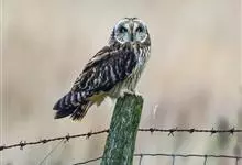 短耳鸮又名小耳木兔、田猫王、夜猫子等,是鸮形目鸱鸮科耳鸮属中小型猛禽动物。成鸟面盘显著,眼周黑色;眼先及内侧眉纹灰白色,面盘余部棕黄色杂以黑色细羽干纹;耳簇羽短小而几乎不外露,…全部>>